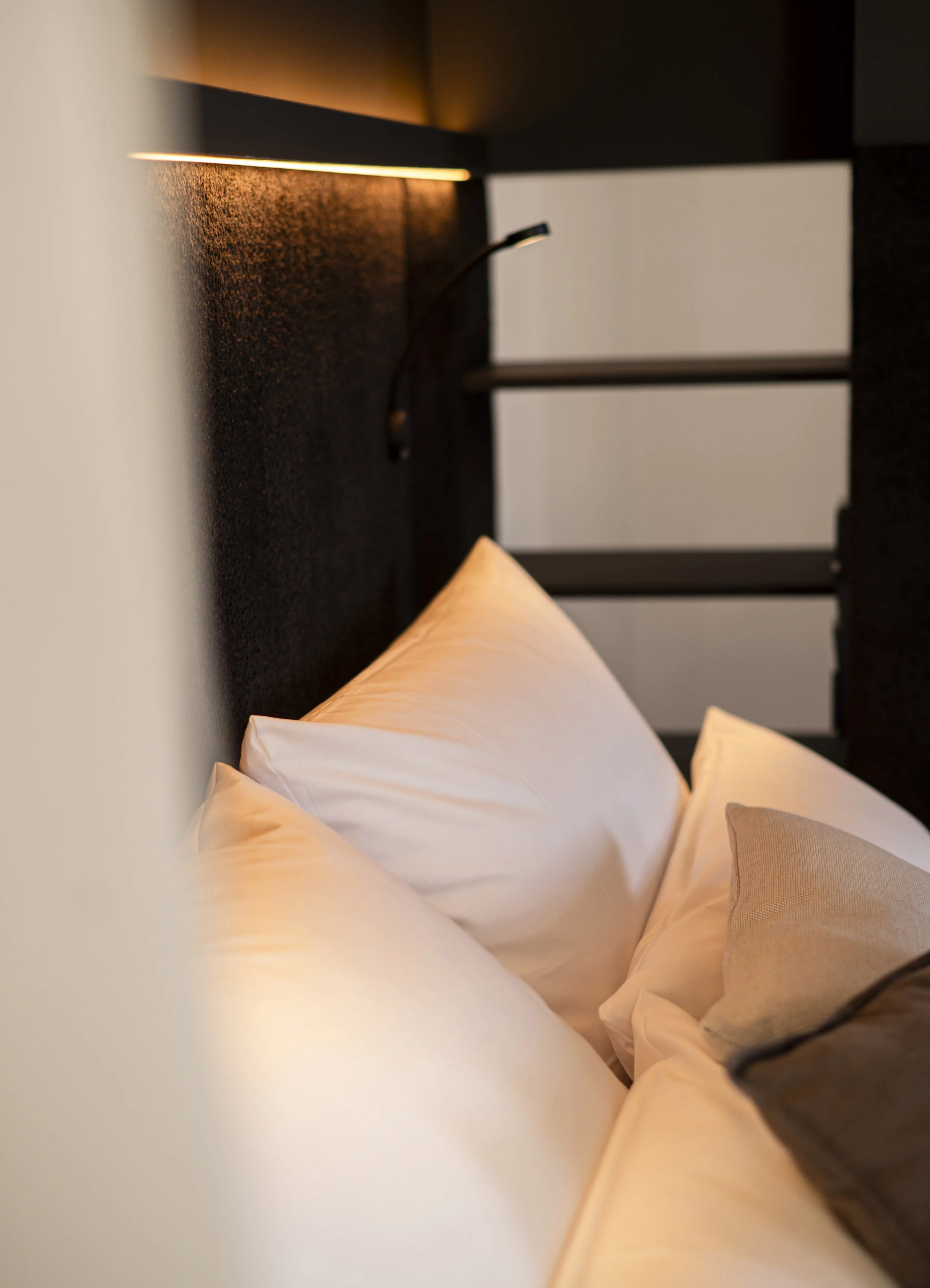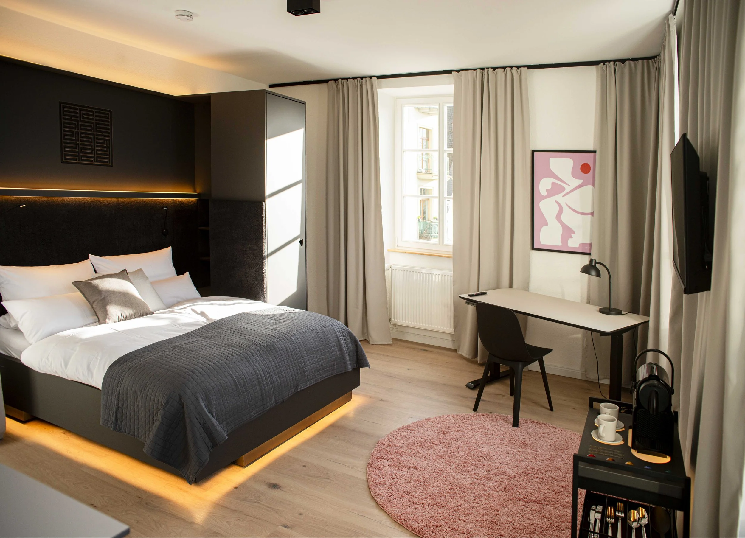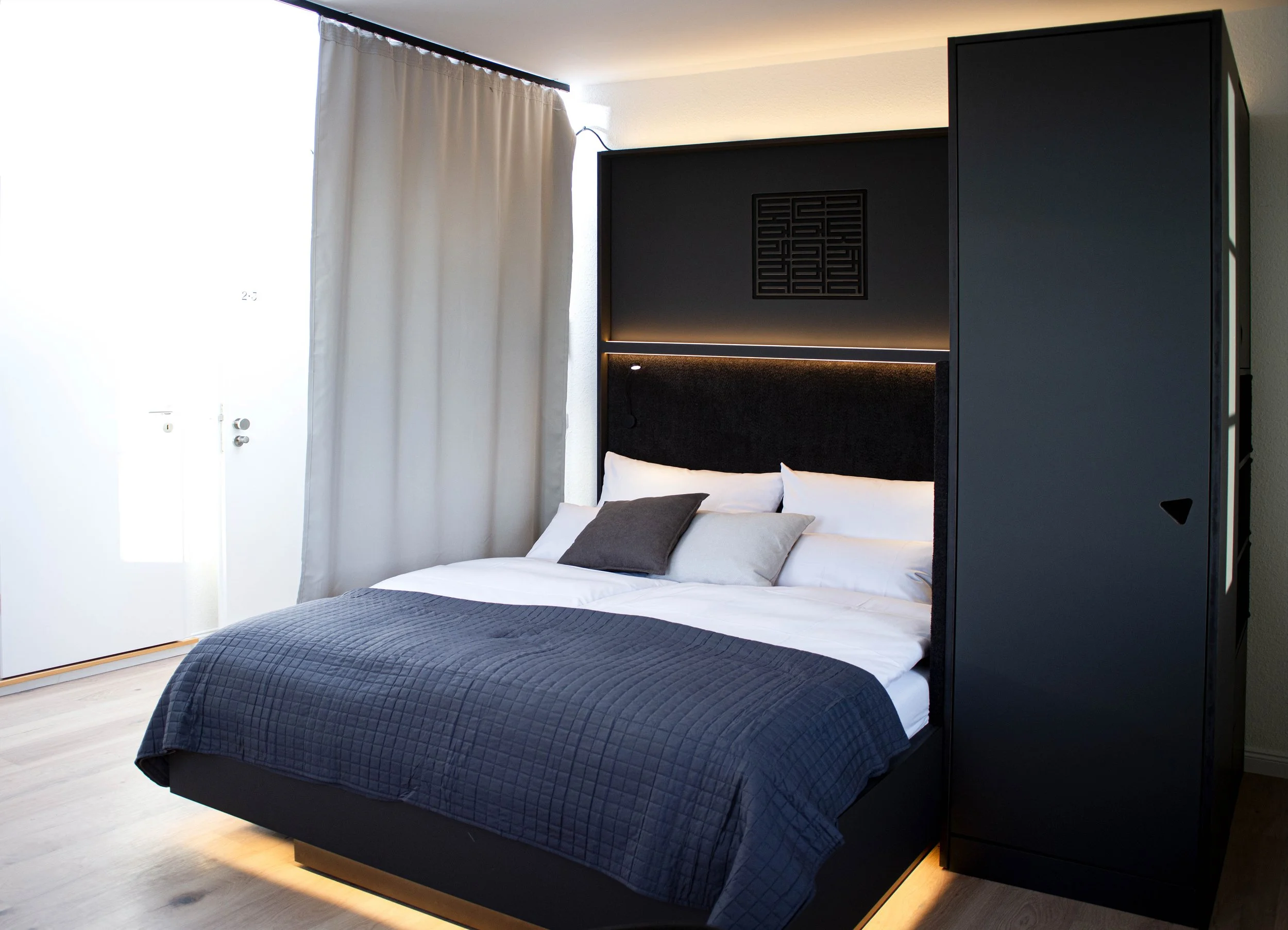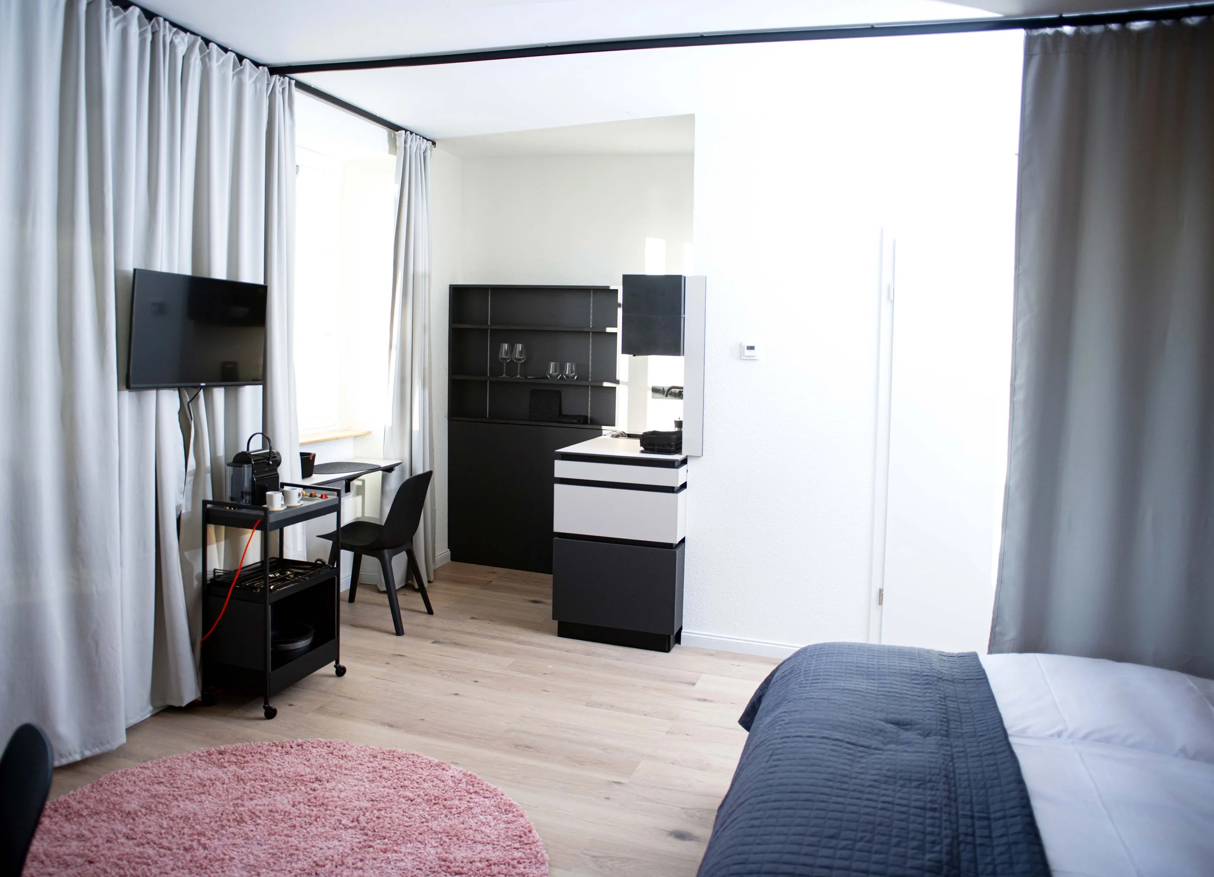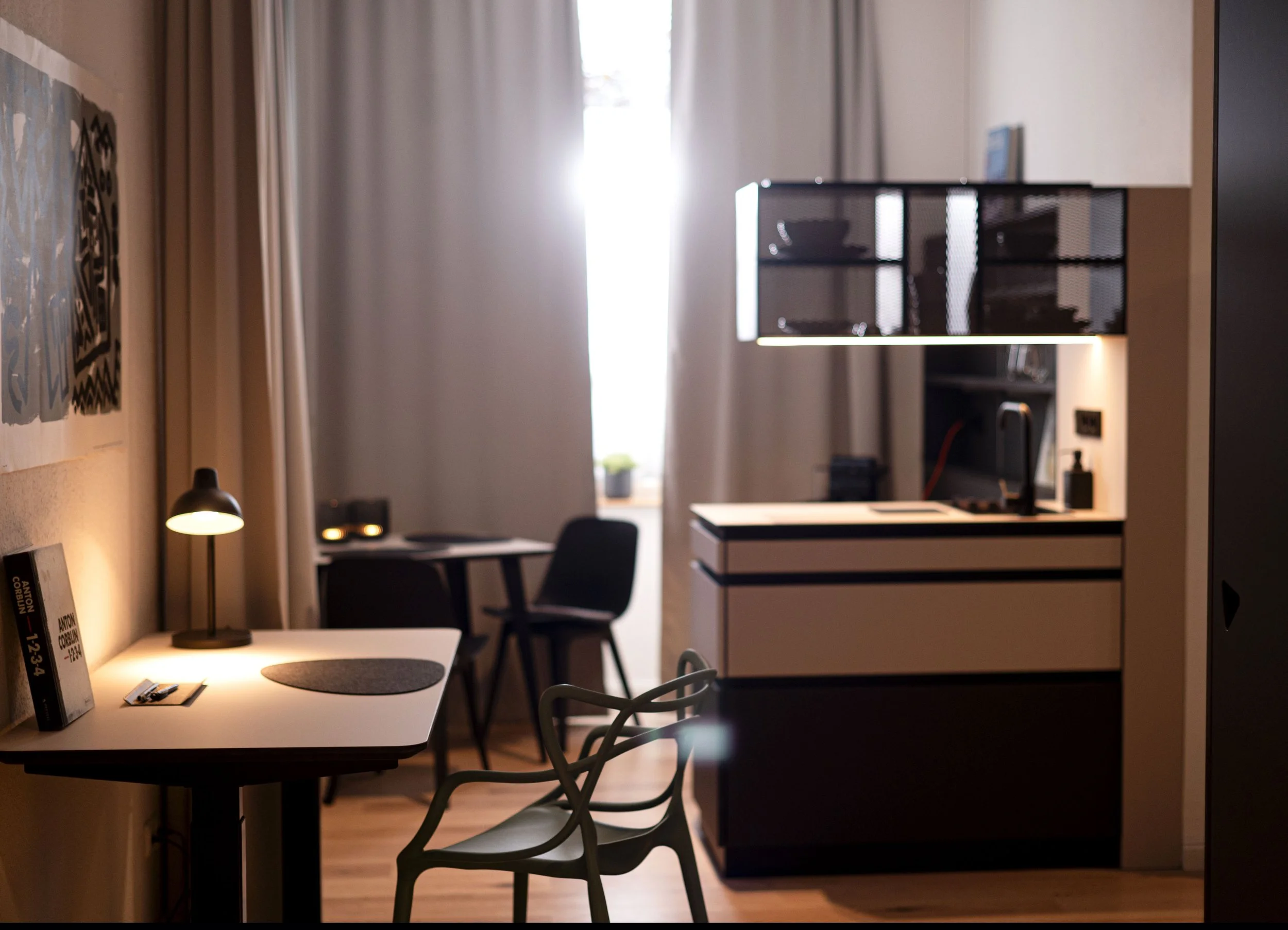 Besides our community kitchen and shared co-working spaces, each apartment has a small area to work and study. Use our in-room curtains to separate your working space a bit and increase your focus time.