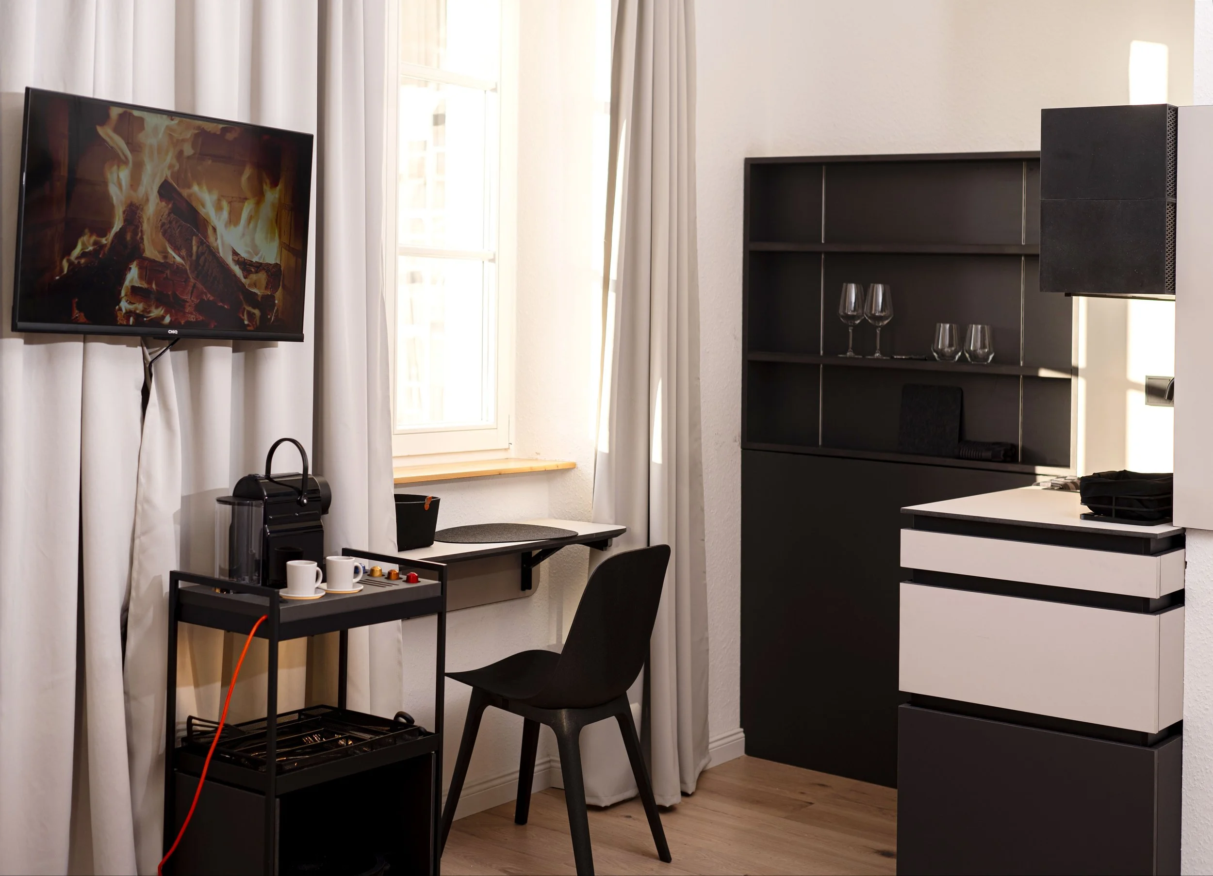Besides our shared community kitchen each room as a private and fully equipped kitchen, including a fridge, cooking plates, coffee machine, dishes, pans, pots, as well as both wine and standard glasses, and a complete set of silverware. Everything you need to cook.